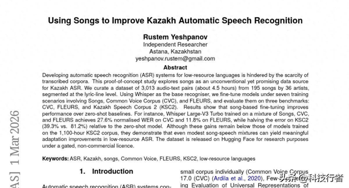 这项研究的独特之处在于,研究者将目光投向了一个前所未有的数据来源——歌曲。这个想法听起来或许有些不寻常,但仔细想想,歌曲几乎存在于每一种语言和文化中,而且通常都有高质量的录音和相应的歌词文本。研究者收集了195首哈萨克歌曲,涵盖36位艺术家的作品,创建了包含3013个音频文本对的数据集,总时长约4.5小时。